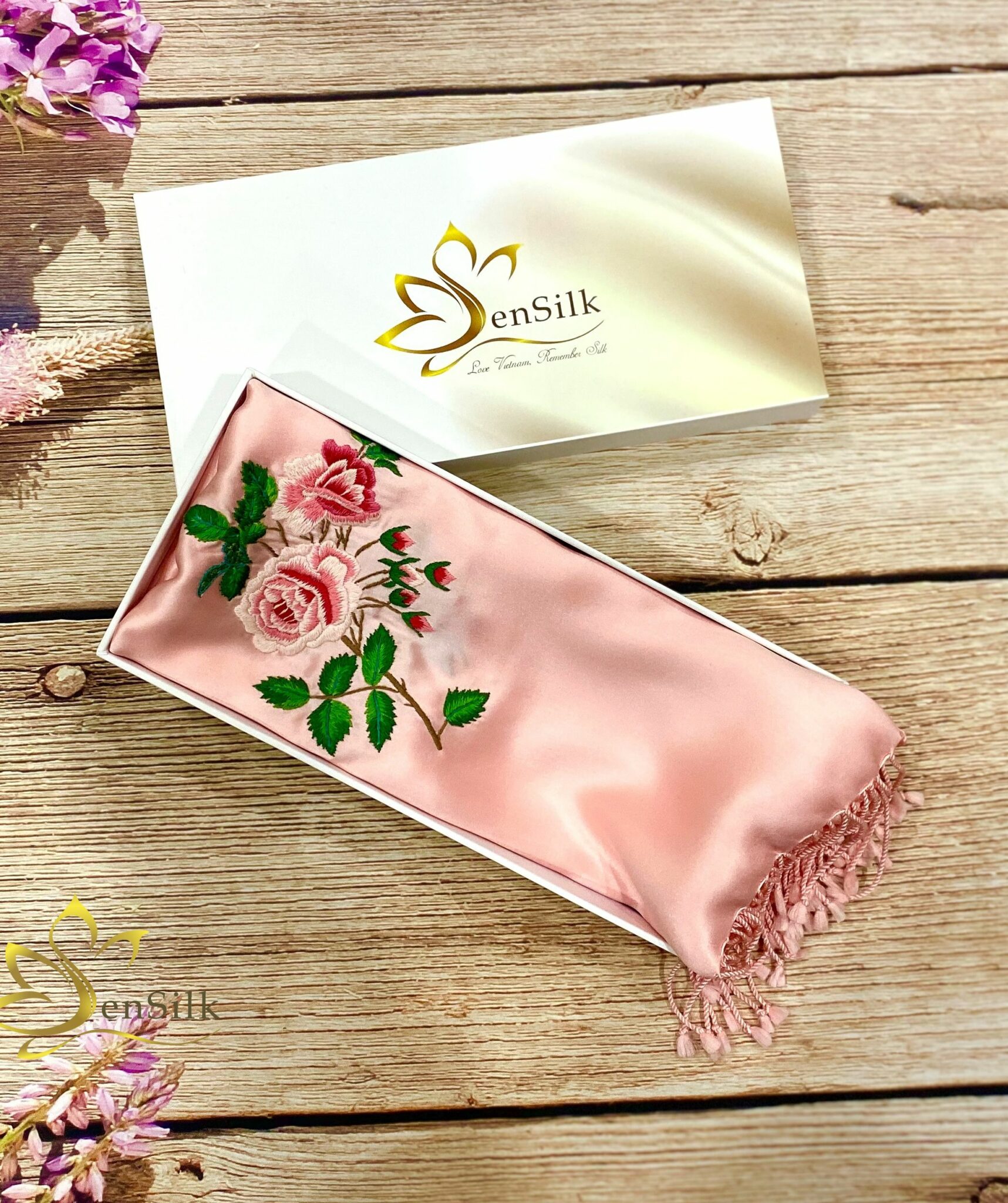 Khăn Lụa Tơ Tằm Thêu Tay Hoa Hồng SenSilk Luxury – Nữ chúa của các loài hoa– tượng trưng cho một tình yêu nồng cháy và lãng mạn.
