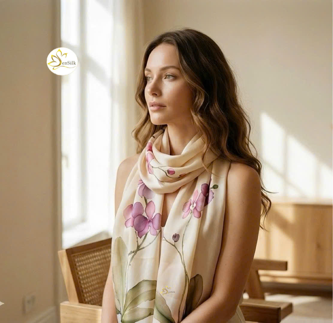 Khăn Lụa Tơ Tằm Vẽ Tay Sen Silk | Quà Tặng Cao Cấp Ý Nghĩa Với Thiết Kế Hoa Lan