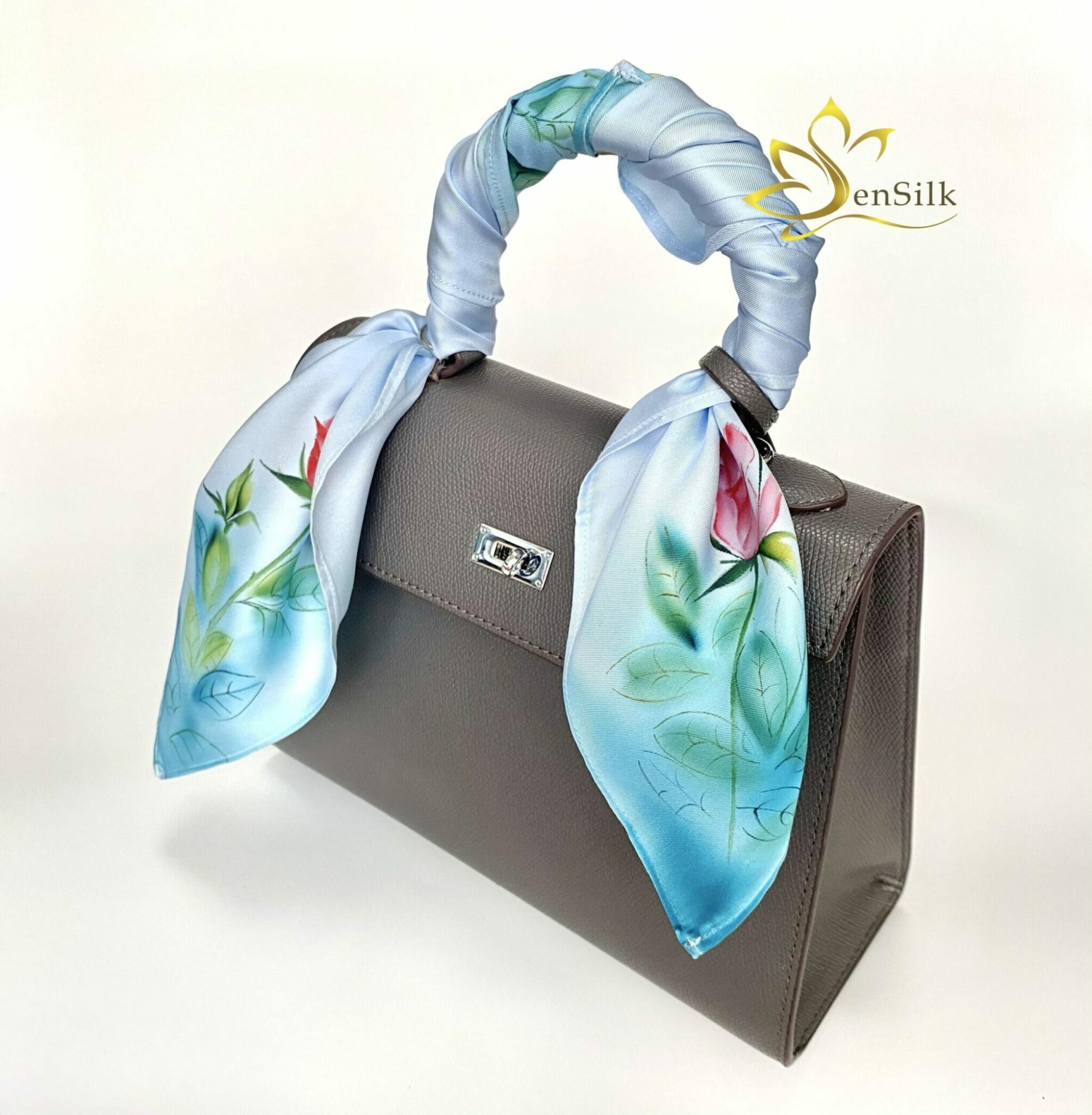 Chiếc khăn lụa vuông thần thành tuy nhỏ nhắn nhưng lại có vô vàn lợi ích nhờ tài năng biến hóa của chị em: lúc là chiếc nơ buộc tóc-túi, khi thì thắt cổ tay sang chảnh, hay đơn giản làm một chiếc thắt lưng lụa mềm mại