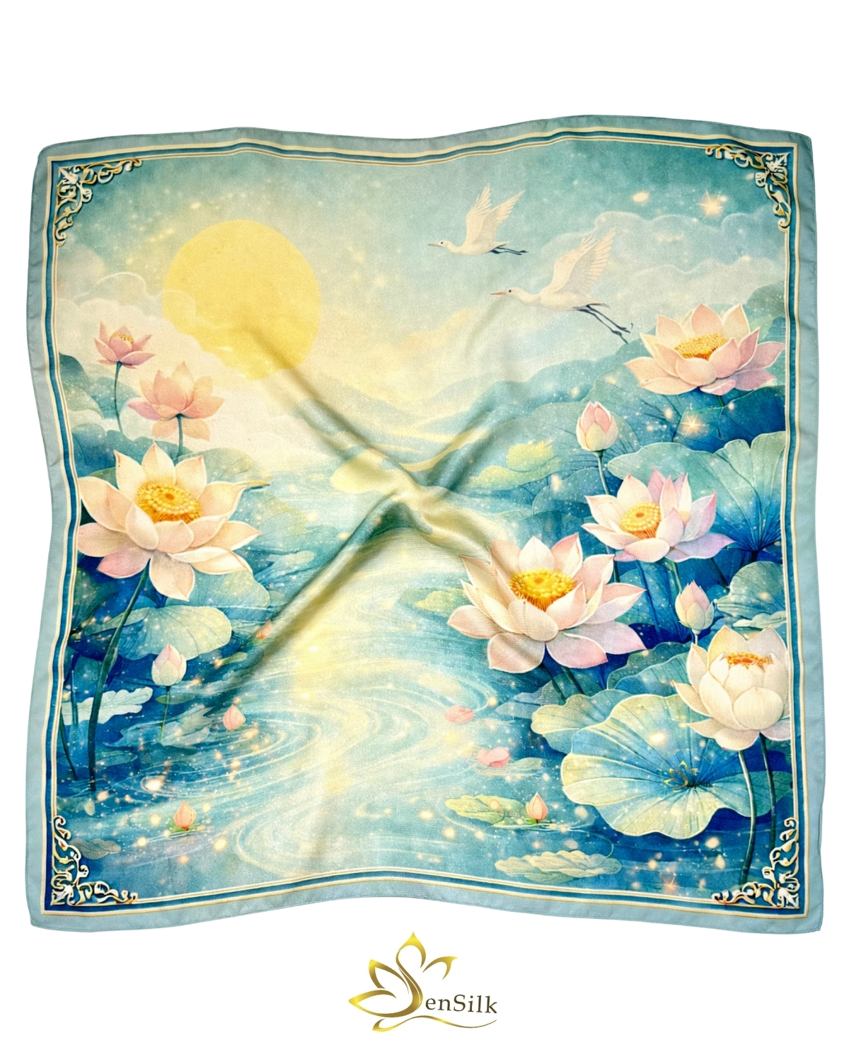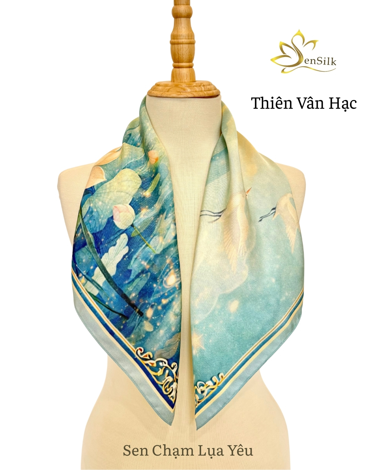 Khăn lụa tơ tằm in kỹ thuật số Thiên Vân Hạc là thiết kế nghệ thuật thuộc BST Sen Chạm Lụa Yêu của SenSilk, lấy cảm hứng từ hình ảnh sen và hạc – biểu tượng của sự thanh cao, may mắn và trường tồn trong văn hóa Á Đông.
