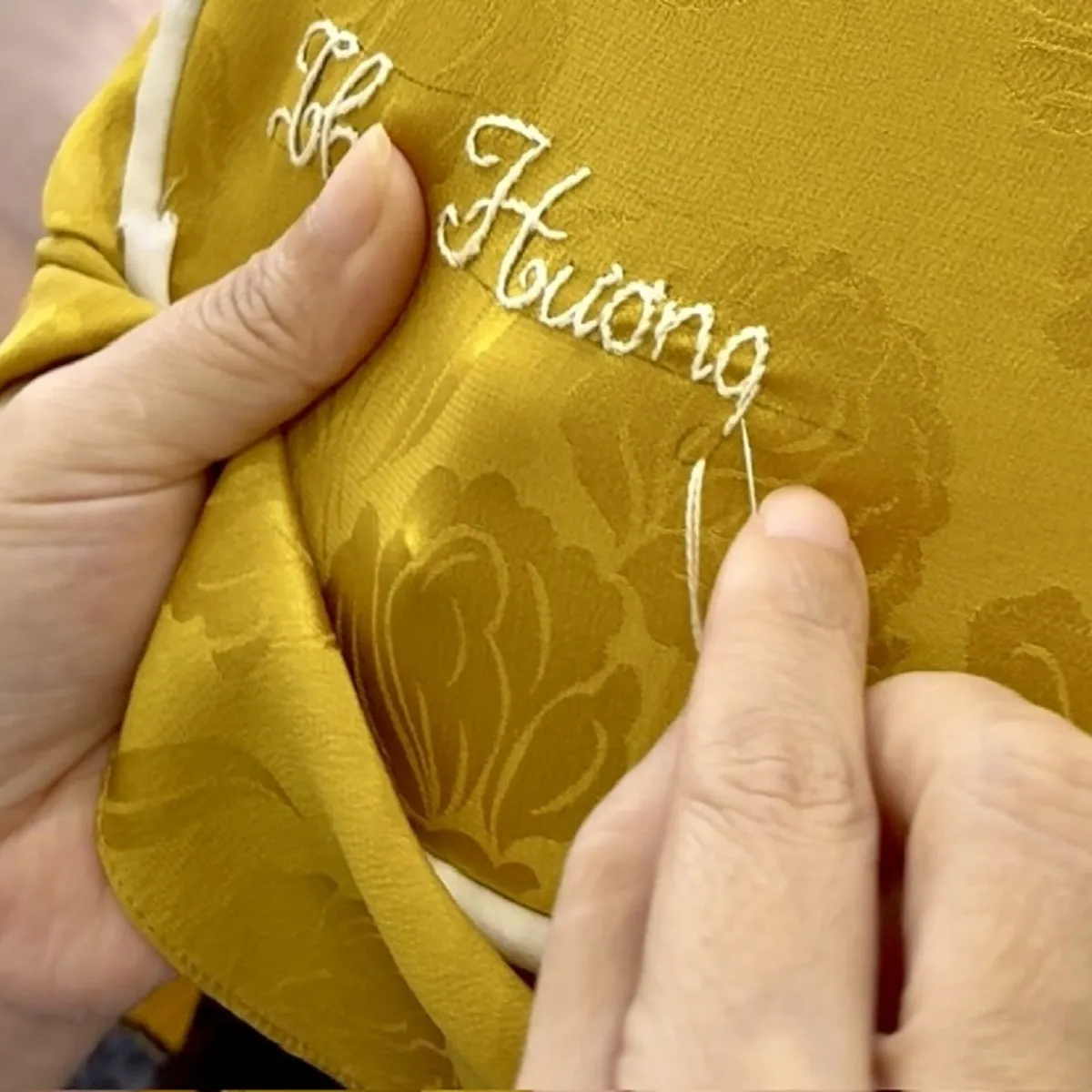 Khác với thêu máy, thêu tay cho phép tạo nên độ nổi mềm tự nhiên, giữ trọn vẻ rủ và cảm giác tinh tế của lụa tơ tằm.