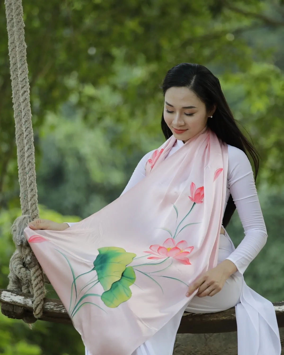 Dòng khăn đại diện cho giá trị thủ công cốt lõi, nơi nghệ nhân vẽ tay trực tiếp trên nền lụa tơ tằm, tạo nên những thiết kế độc bản không lặp lại.