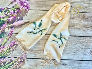 Dưới đôi bàn tay của nghệ nhân Làng nghề thêu ren Văn Lâm (Ninh Bình), sắc xanh tươi mơn mởn của nhành lá xanh và màu hồng phai của hoa đào được thêu tay điểm xuyết vừa đủ tinh tế trên nền lụa óng màu vàng nude nhẹ nhàng, tinh tế; kết hợp độ rủ mềm mại của lụa tơ tằm tự nhiên, Khăn lụa dài thêu hoa mang đến cho các nàng vẻ đẹp cao sang mà căng tràn sức sống.