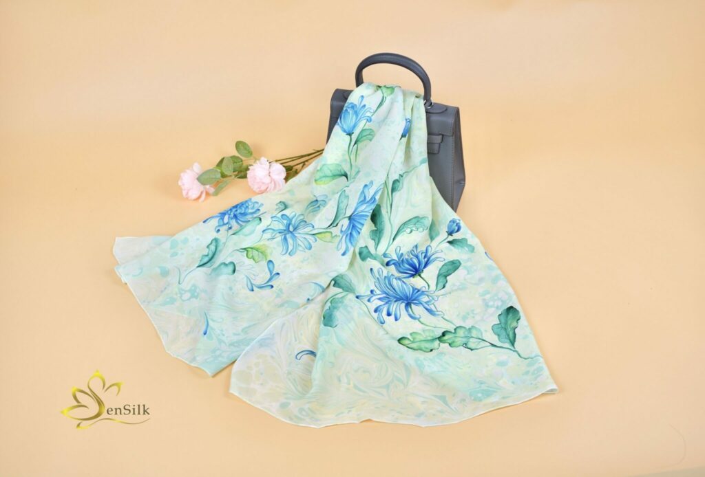 Water Marbling Silk – Khăn Lụa Thủy Ấn – Hoa Cúc Xanh
